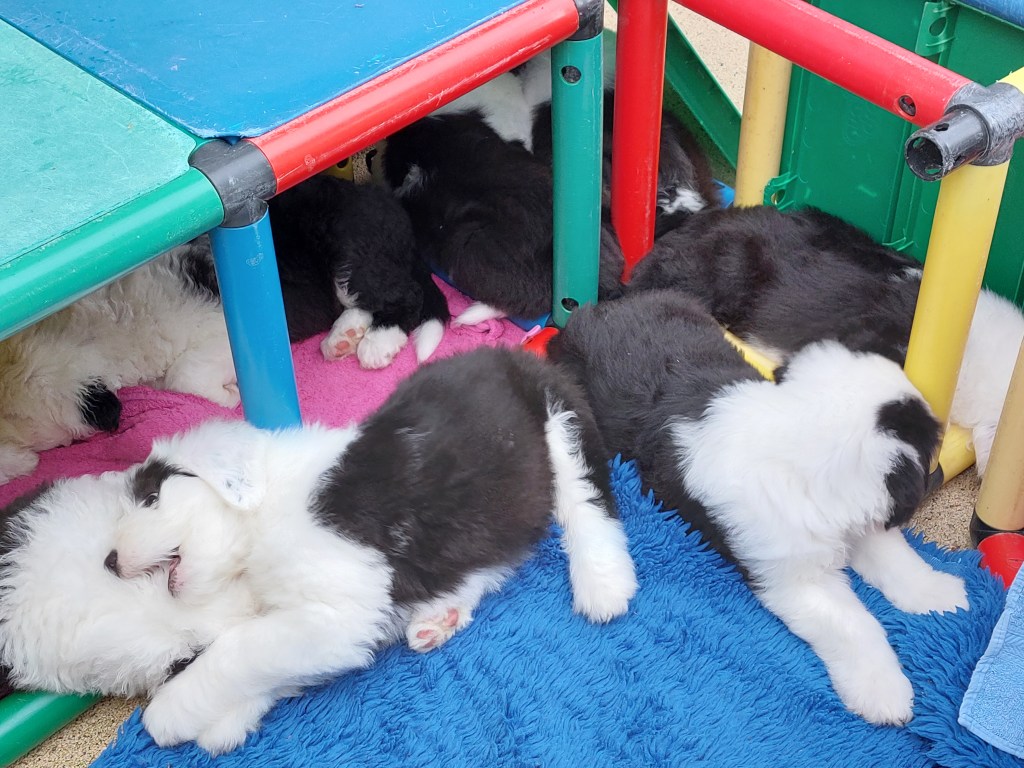 Bilder Welpen Woche 7 am 11. Mai 2022 von Velvetfeet Eddy (Rüde 1) Enyo (Rüde 2) Elio (Rüde 3) Easy (Rüde 4) Ella (Hündin 1) Emma (Hündin 2) Eliza (Hündin 3)